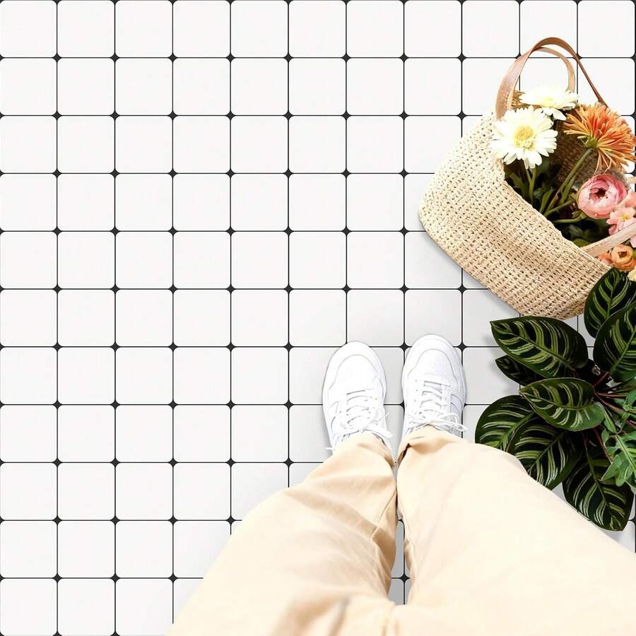 10/20pcs 8" X 8" Self-Adhesive Vinyl Floor Tiles, White Square With Green Outline Waterproof Removable Tile Stickers, Suitable For Kitchen, Bathroom, Stairs, Living Room, Pet Room