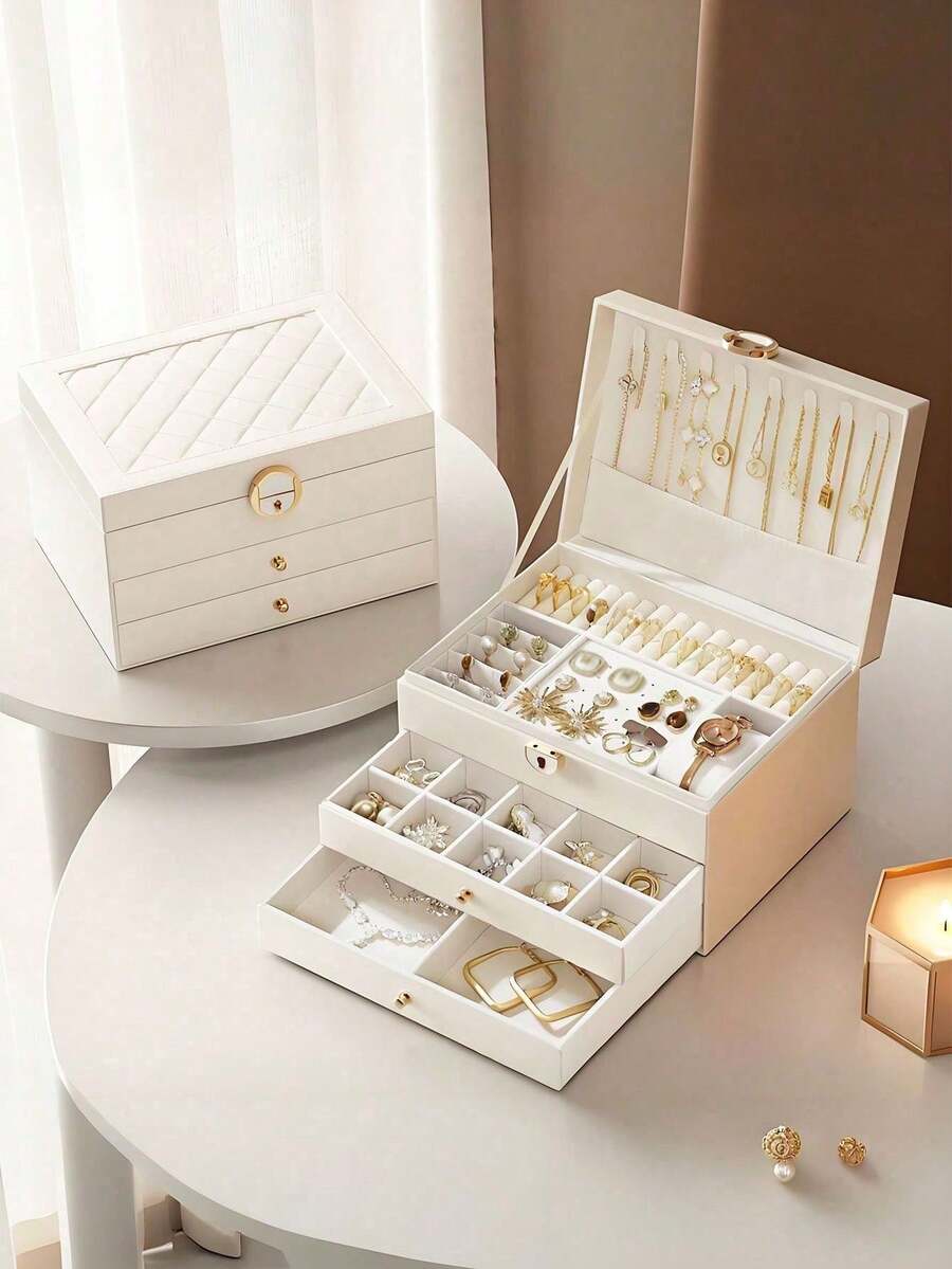 1pc Luxury Diamond Pattern Lockable Jewelry Box, Multi-Layer Jewelry Storage Box, Earring Organizer, Vanity, Bedroom Accessory, Home Organization & Storage, Room Decor, Gift For Women
