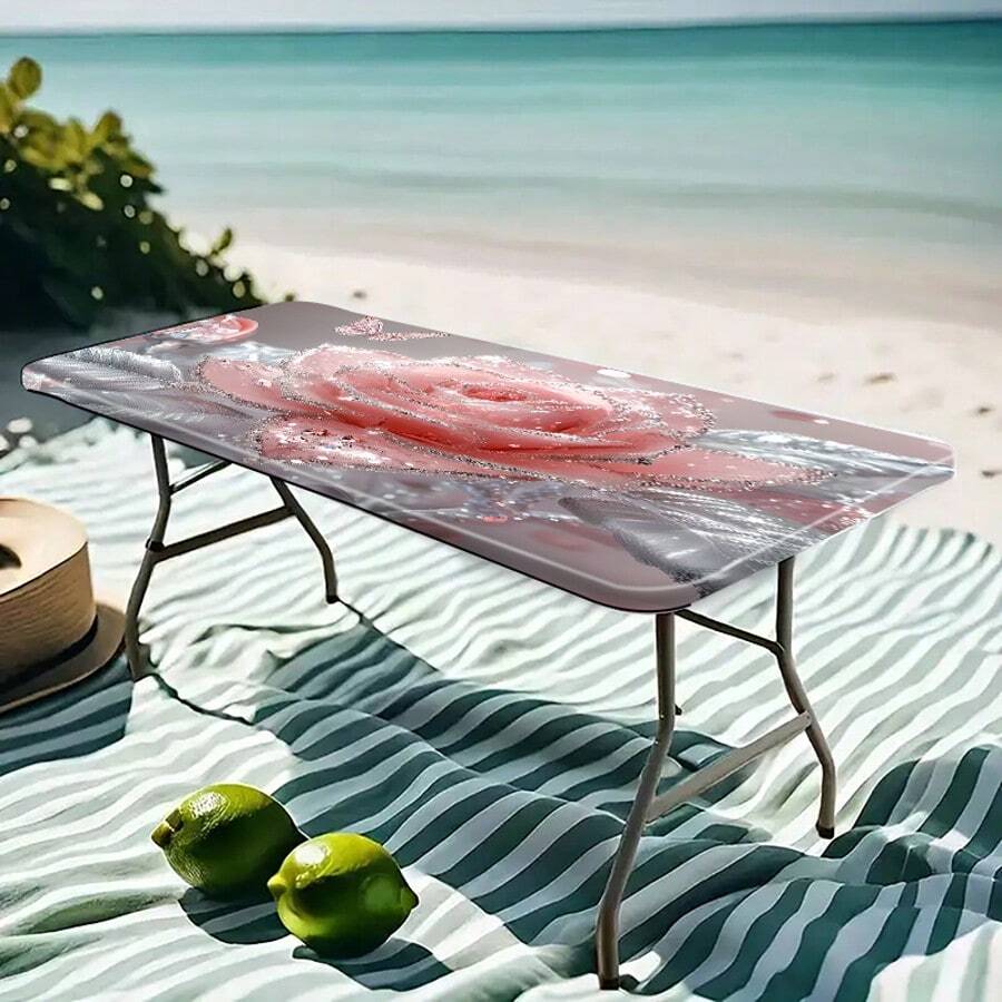 1pc Pink Crystal Rose Tablecloth - Luxury Decorative Rectangular Tablecloth For Wedding, Party, Home Decor, Outdoor Picnic Table Cover With Elastic Corners, Vibrant Color, Polyester Fabric, Mandala Pattern, Picnic Accessory