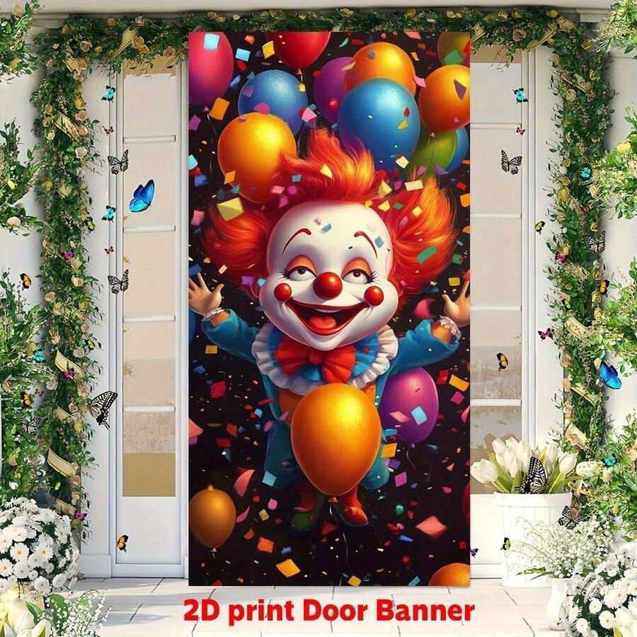 2D Flat Door Banner, 1 Pc Extra Large Carnival Party Door Banner - Clown And Balloon Decorations, Vibrant Red Hair, Birthday Wedding Party Decor - No Electricity Required, Easy-Hang Door Curtain For Home, Events, Daily Decor - Polyester Fabric, Carnival-Themed Party Decor, Festive Home Decor, Fun Design, Outdoor-Suitable Material, Lightweight Material