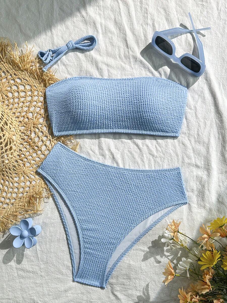 2pcs/Set Ribbed Bikini Swimsuit, Graduation/Independence Day Suitable Swimwear In Black, Red, Purple