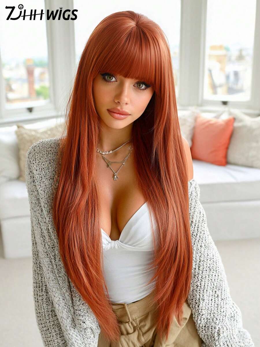 7JHH WIGS 34 Inch Extra Long Straight Maple Leaf Orange Wig With Bangs - Super Long Natural Layered Wigs, High Quality Soft Synthetic Fiber Wigs For Women Daily Wear, Festival Ready Party Use, Graduation Gift - Beginners Glueless Wig Accessories