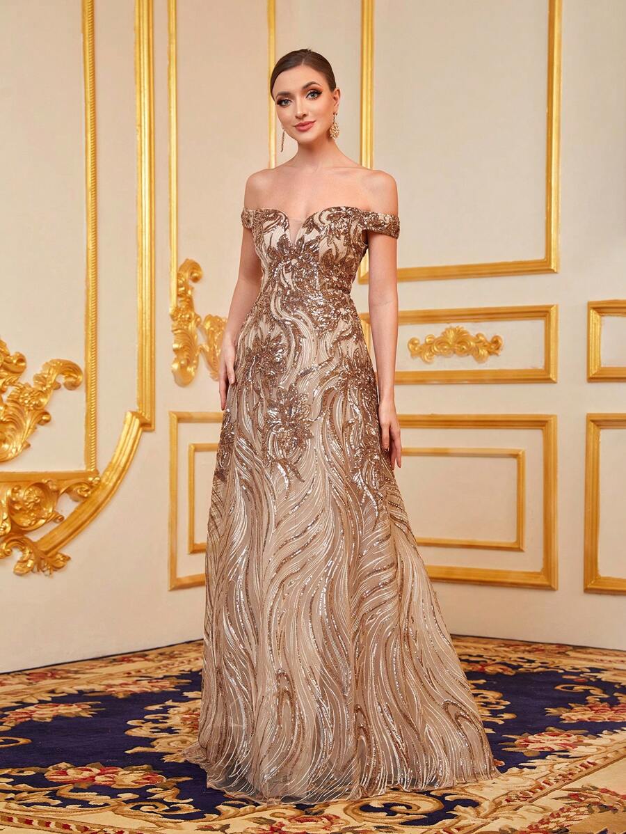 Faeriesty Elegant Off-The-Shoulder Formal Evening Gown For Women With Corset Waist Ties And All-Over Floral Applique Sequins Embroidery