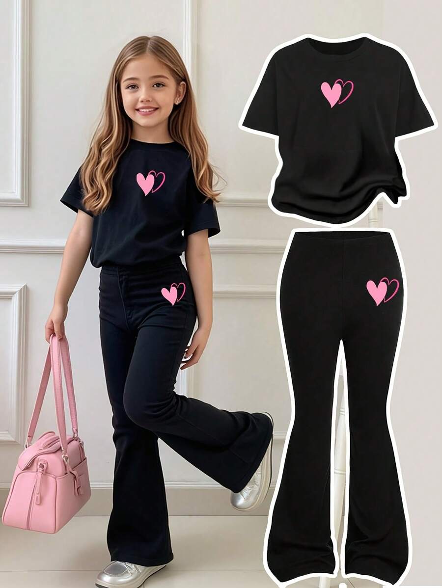 Girls 2-Piece Heart Print Short Sleeve T-Shirt And Skinny Stretch Flare Pants Set, Back To School/Matching Outfits For Friends & Sisters