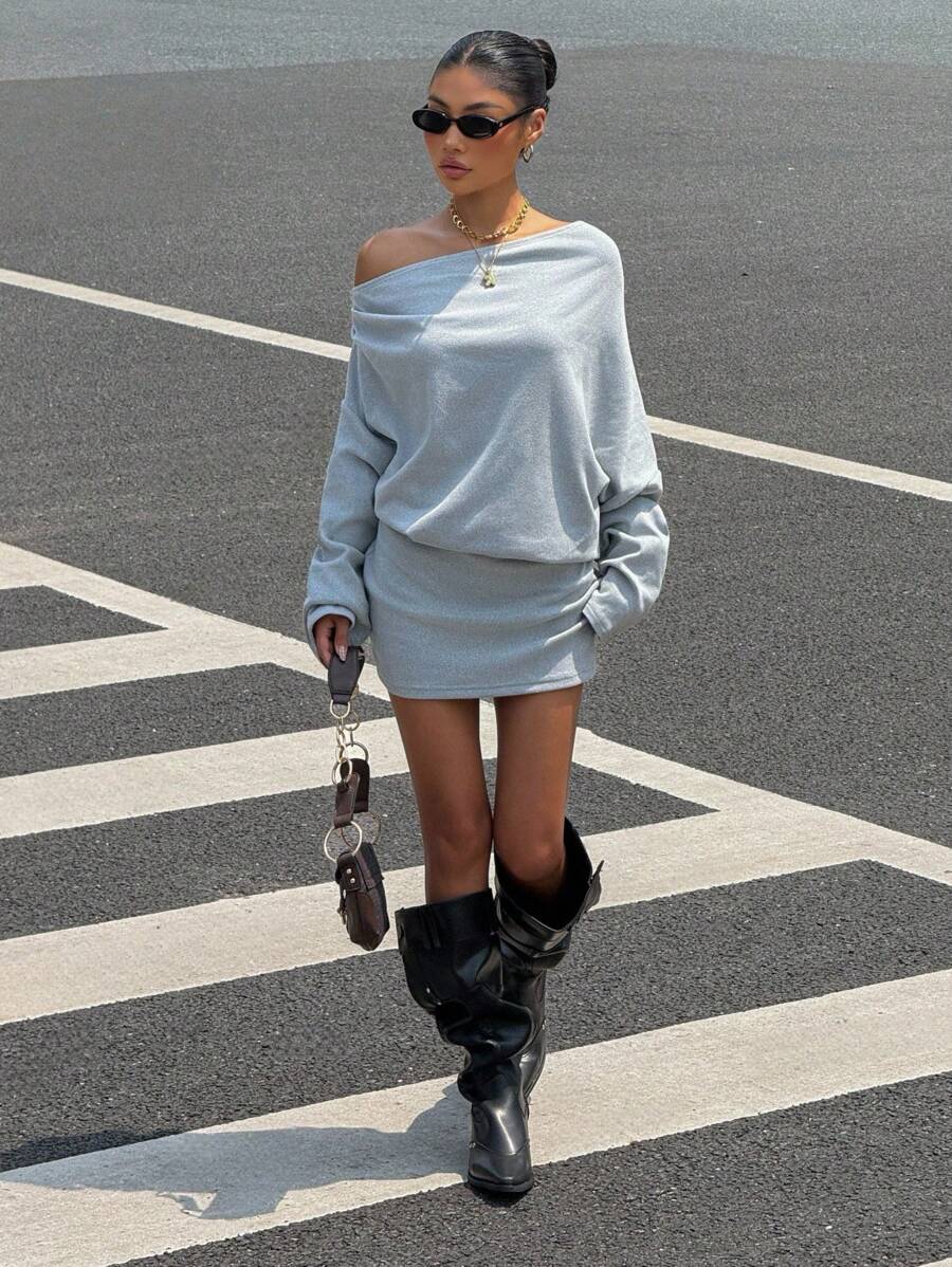 Muchica Women's New Autumn Cashmere Off The Shoulder Long Sleeve Bodycon Dress,Y2k Dress, Streetwear
