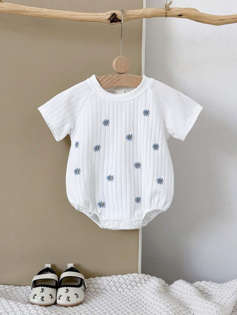 Newborn Baby Girl Sweet Embroidered Ditsy Floral Short Sleeve Romper, Summer