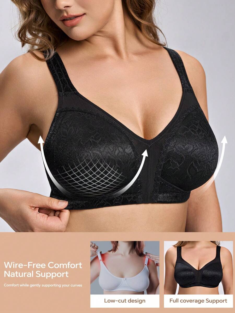 WINGSLOVE Plus Size Wireless Seamless V-Neck Full Coverage Bra - Unpadded Jacquard Wide Straps, Soft Breathable Fabric, All-Day Comfort