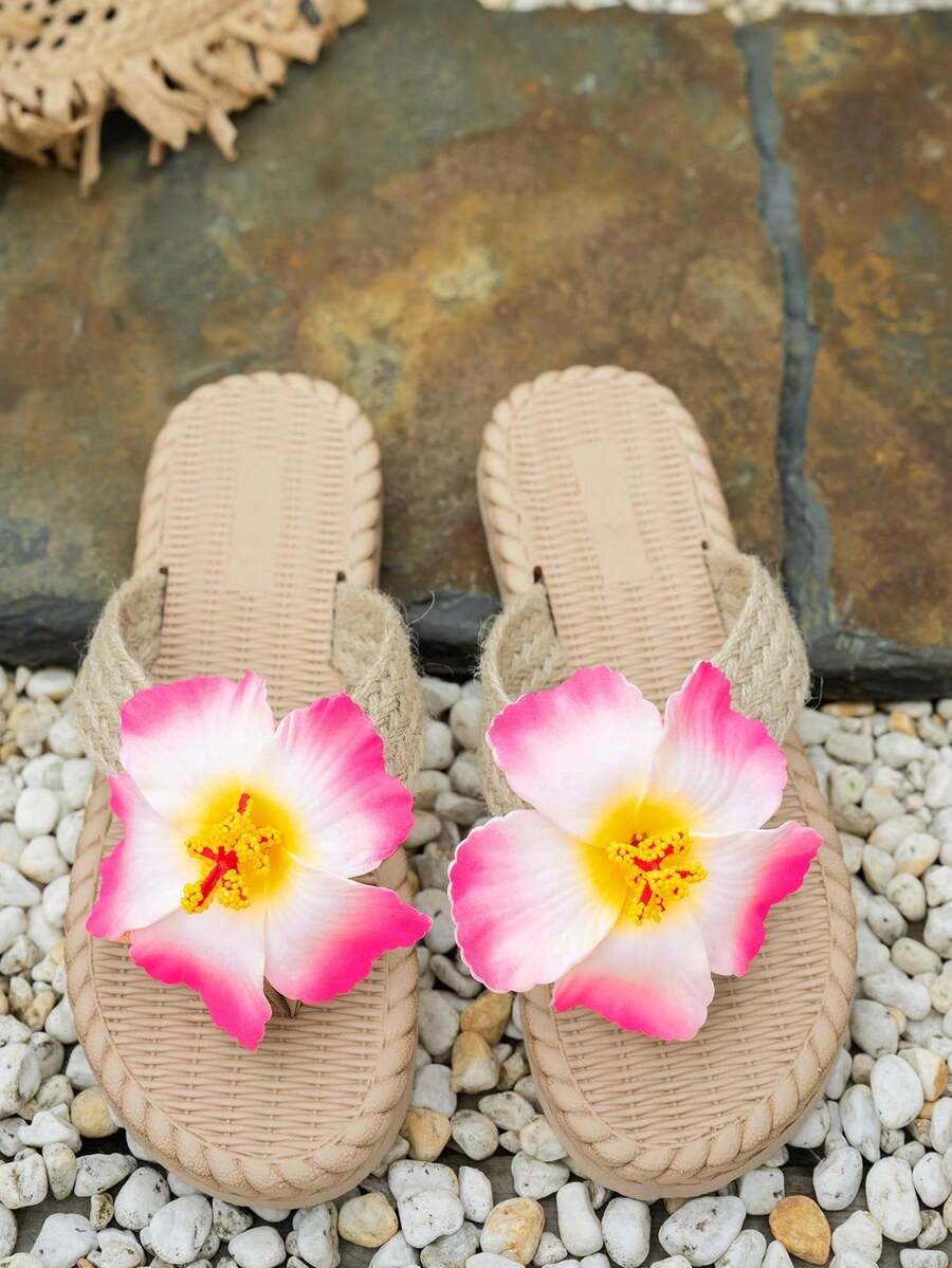planare Women's Fashion Versatile Party & Vacation Style Woven T-Strap Sandals With Cute Pink Fabric Orchid Decor, Braided Raffia Upper, Round Toe Thong, Lightweight Anti-Slip Thick EVA Sole, Slip-On Casual Beach Pool Slippers For Shorts, T-Shirts, Dresses