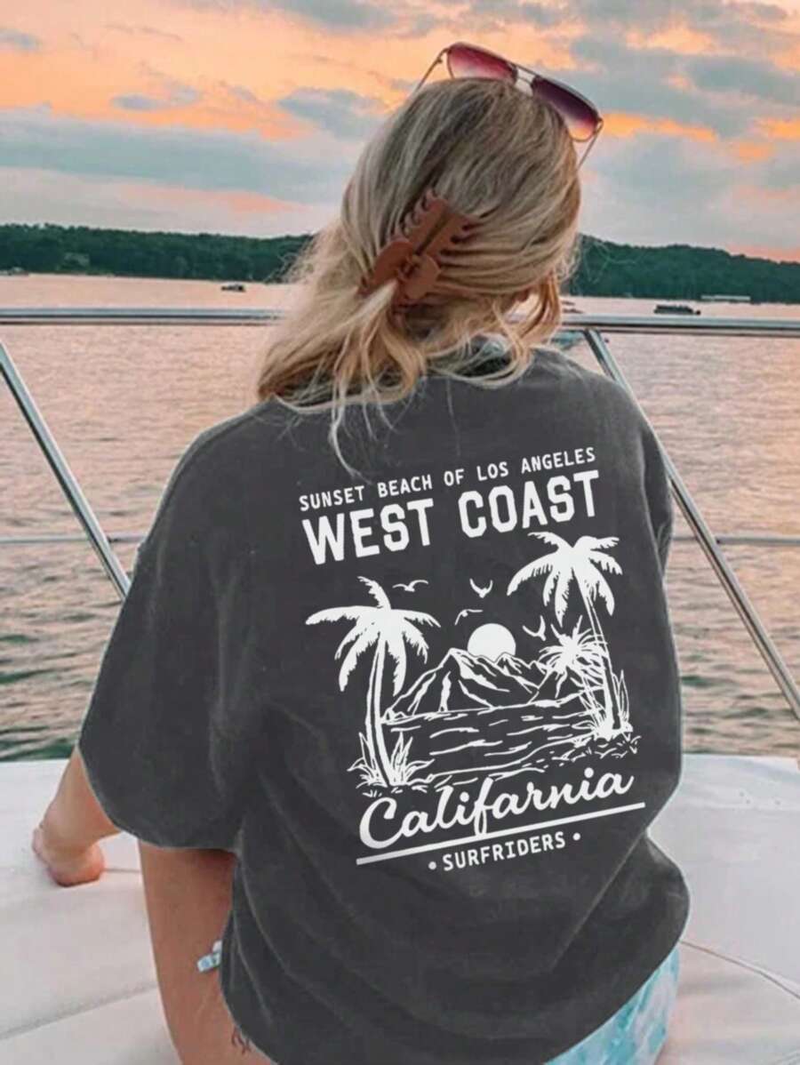 Women's New Summer Casual Round Neck Short Sleeve T-Shirt, Minimalist Versatile Palm Tree Slogan Print, Suitable For Daily Wear. Graphic Tee, Women's White Top, Black Top, Pink Top, Vacation Outfit.