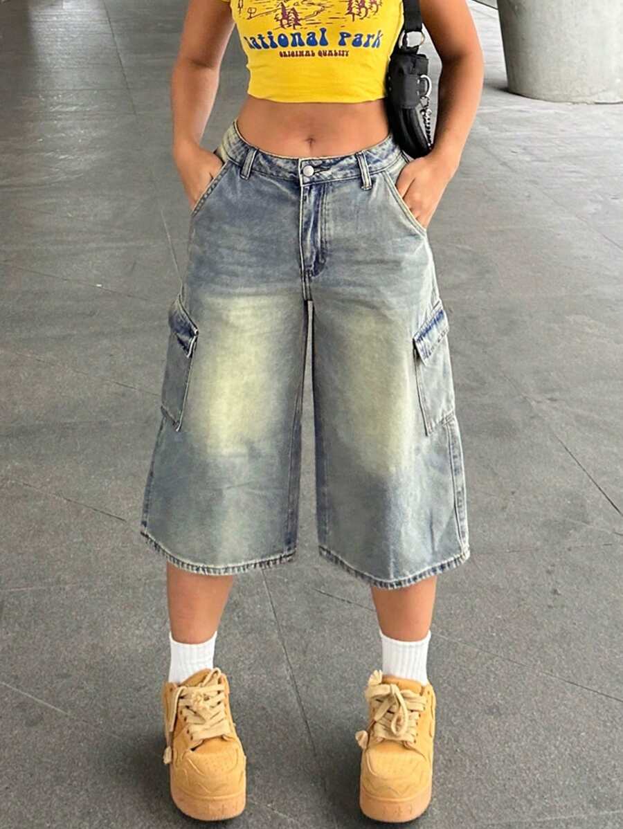 Women's Vintage Y2K Distressed Denim 7/8 Length Cargo Jeans