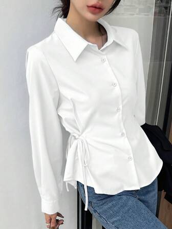 DAZY 1개 여성 비즈니스 캐주얼 솔리드 컬러 라펠 긴팔 허리 타이 블라우스 여름