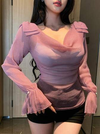 DAZY 여성용 반짝이는 보우 타이 메시 시스루 넥 긴소매 캐주얼 탑