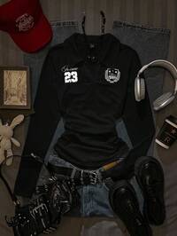 Attitoon Women's Casual Fashion, College Style Badge & Number 23 Print Turndown Collar Long Sleeve T-Shirt, Tight Fit Autumn/Winter Undershirt, Black